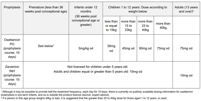 Inpatients exposed to influenza cases (e.g. bay contact) should be offered prophylaxis (10 days OD regimen - see table at bottom)