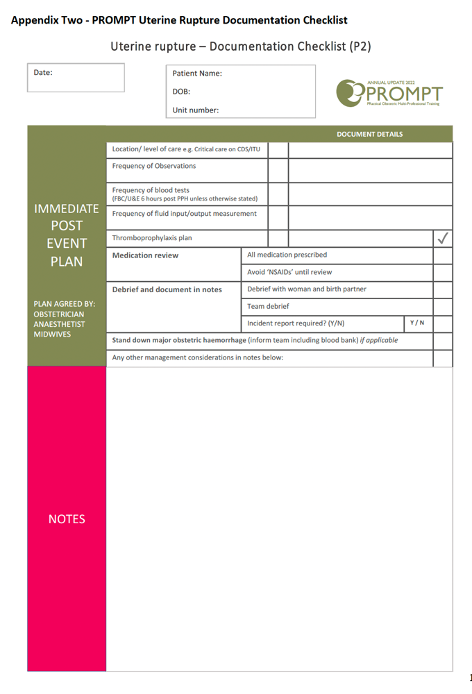 - Detailed postnatal plan should be documented immediately to include place of care – obstetric HDU/ ITU, fluids, analgesia, antibiotics, VTE prophylaxis and catheter care