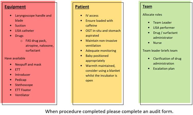 As per our current guideline on the respiratory management of preterm infants the preferred initial management is using primary CPAP with the use of rescue surfactant for infants with an increasing oxygen requirement. To reduce the need for MV but still deliver surfactant several less invasive techniques have been developed. One of these techniques is called LISA (Less invasive surfactant administration) and is the process of delivering surfactant directly into the lungs via a fine bore catheter inserted into the trachea3. In a recent review by Wu et al4, LISA technique was associated with a significant reduction in the risk of mechanical ventilation within 72hours and bronchopulmonary dysplasia at 36 weeks compared to other strategies of surfactant administration (p<0.00001). These findings have been also been seen in a meta-analysis by Isayama et al in 20151 and most recently by Aldana-Aguirre et al who found a lesser need for MV and a reduction in the composite outcome of death or BPD at 36 weeks compared to INSURE (p 0.01)2.