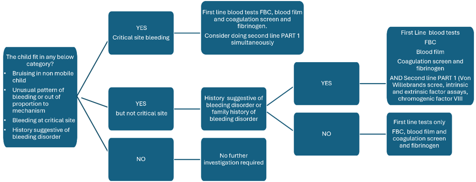 Second line part two investigations should only be done after discussion with paediatric haematology. This can be with the registrar who would be expected to discuss all child protection cases with the on-call consultant. In cases of high suspicion of a bleeding disorder, it may be appropriate to do all second line tests simultaneously with first line tests after discussion with a haematologist, to avoid multiple sampling attempts. Dect phone at RHC is 85645 for the non-malignant haematology registrar.