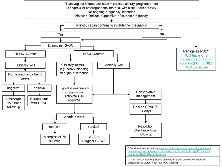 Where RPOC diameter is <30mm, management at home with a repeat home pregnancy test after 3 weeks is appropriate. If test remains positive, further review through EPAS/ Sandyford TOPAR clinic should be offered as appropriate.