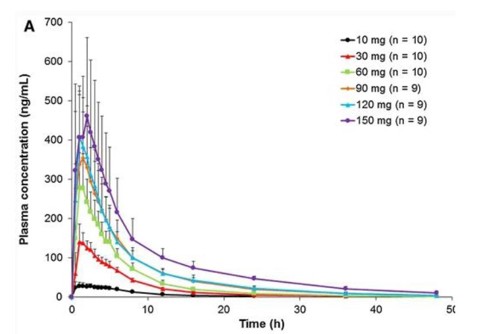 The half-life of edoxaban is demonstrated by the following concentration-time graph [Usual dose 30mg od (≤61 kg) and 60mg od (>61kg)]3: