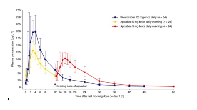 The half-life of rivaroxaban and apixaban (with normal renal function) are demonstrated by their concentration-time graphs2: