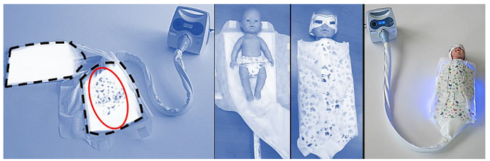 The bag system is reported as being more adapted for term babies. It emits light to front and back, providing 360° exposure. The bag system allows little light from escaping the bag and is adapted for handling, cuddling and breastfeeding the baby. The system is also available in a small size, called Small Bag, to offer a comfortable and effective solution for all different sizes of babies.