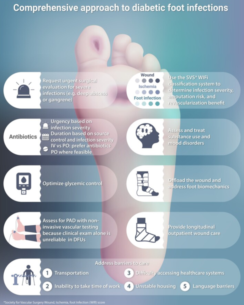 Grading of presence of infection, use Society for Vascular Surgery Wound Ischaemia Foot infection (WIFi) classification score : Mills JL Sr, Conte MS, Armstrong DG, et al. The Society for Vascular Surgery lower extremity threatened limb classification system: risk stratification based on wound, ischemia, and foot infection (WIfI). J Vasc Surg 2014; 59:220–34.e2.