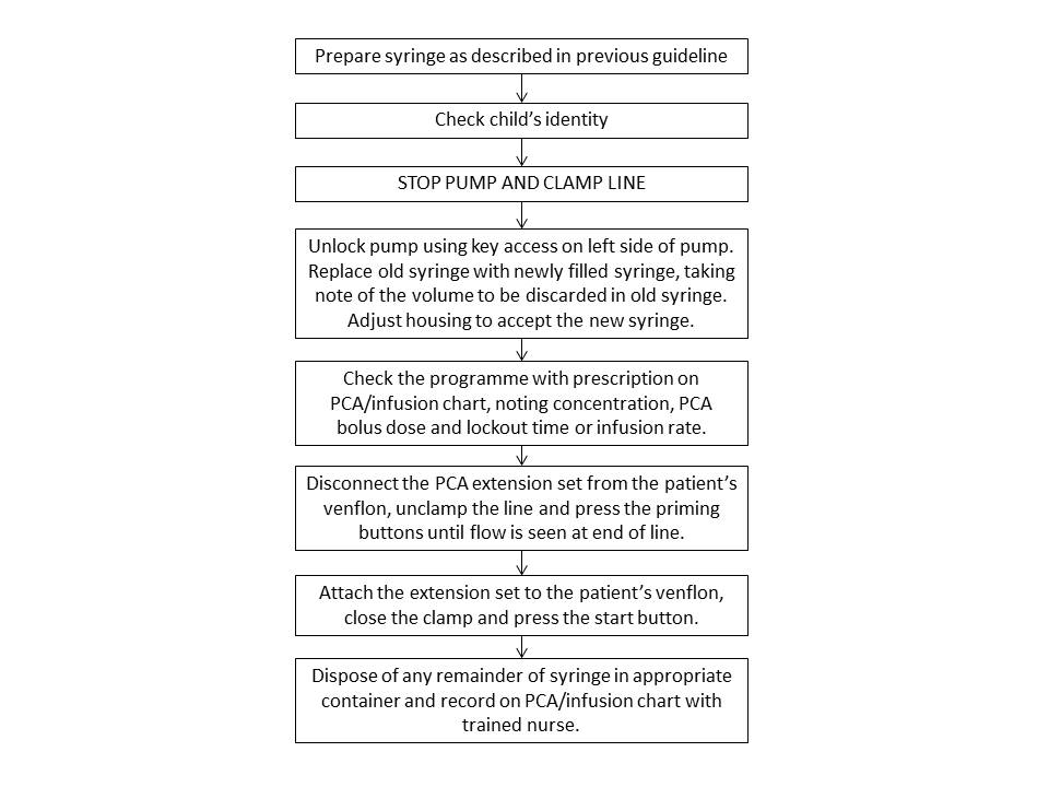 Each change of syringe must be witnessed by a trained nurse or doctor who has received PCA training.  Follow the Hospital SOPs on Preparation and Administration of Controlled Drugs (see resources).