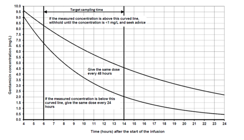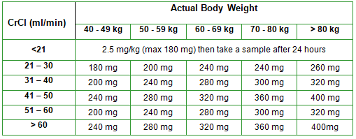 - If the creatinine is unknown give a single dose of 5mg/kg (maximum 400mg), then monitor as below.