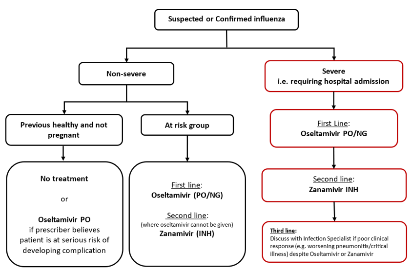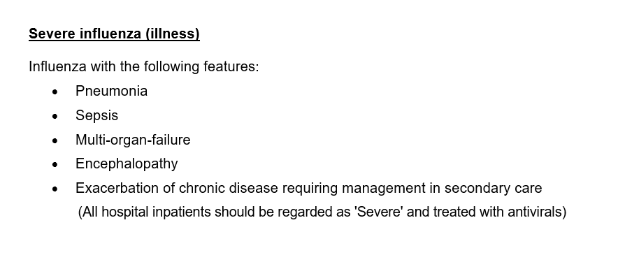 Any patient in hospital with influenza should be treated as 'Severe' influenza; start 5 day antiviral treatment
