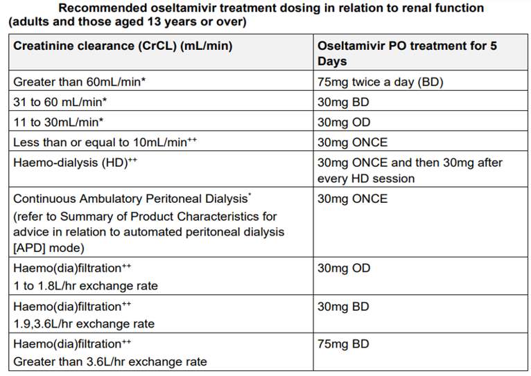 For dose adjustment in children <13 years old with renal impairment - refer to Oseltamivir chapter in the BNF for Children