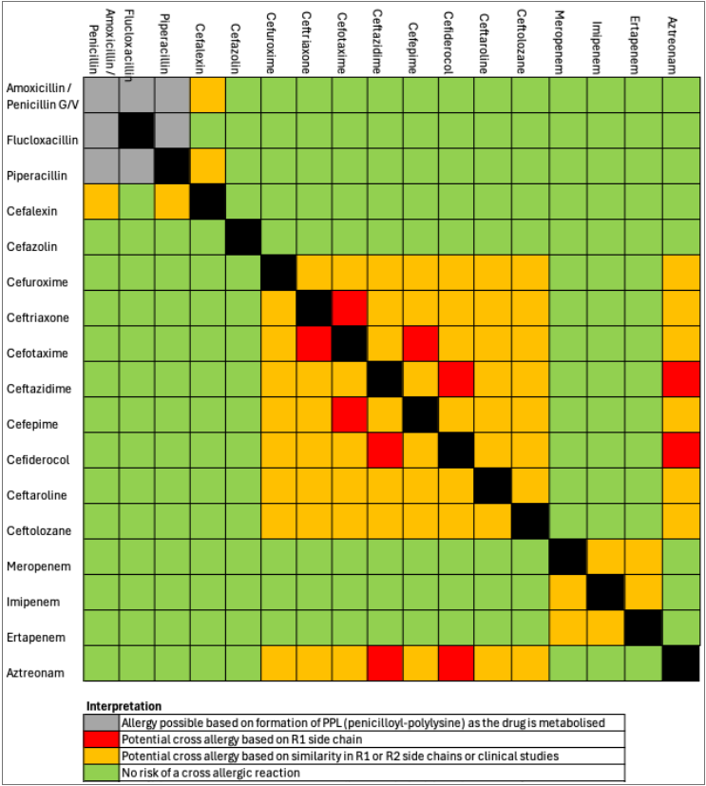 Further information on side-chain similarity between different beta-lactam antimicrobials can be found in the table below. Important cross-reactions include: