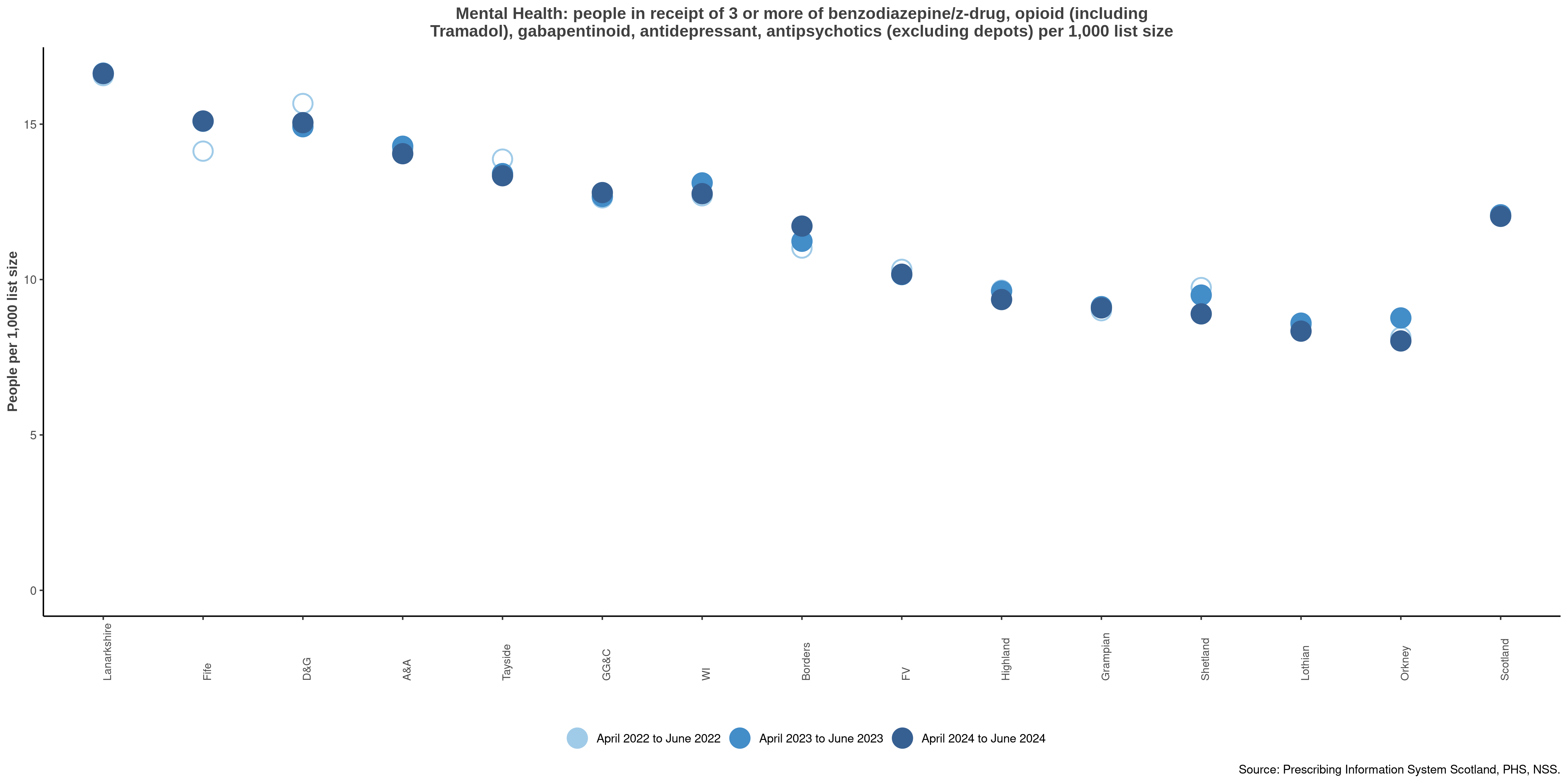 NTI: Mental health triple whammy – All people in receipt of three or more of benzo/ Z-drug, strong opioid (including tramadol), gabapentinoid, antidepressant, antipsychotics (excluding levomepromazine 6mg tabs or injections) per 1,000 list size