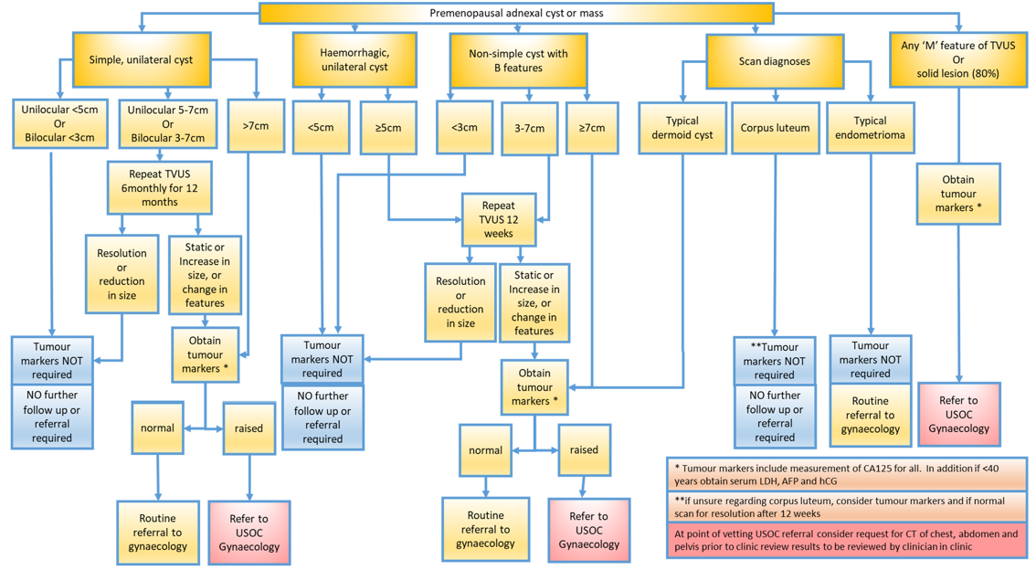 - Where the CA 125 is significantly elevated >200 units/ml, further imaging should be organised e.g. urgent CT Chest, abdomen and pelvis. Referral to gynaecological oncology MDT should be considered once further imaging is complete.