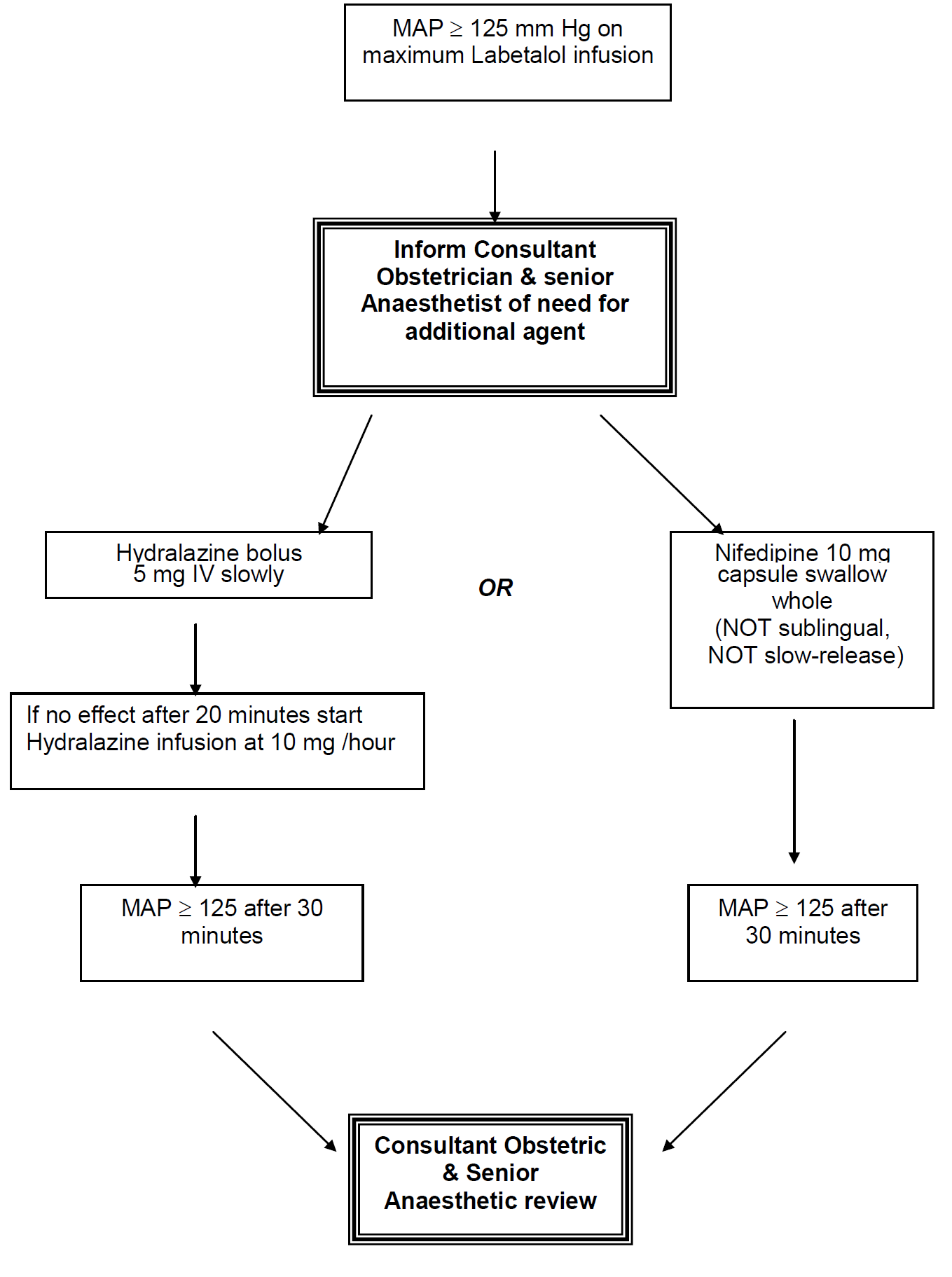 If Labetalol contraindicated or above labetalol regime has failed to control blood pressure - Second Line Agent (Hydralazine OR Nifedipine) (flowchart)