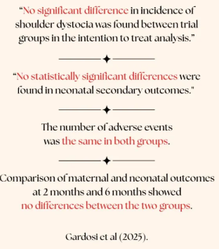 Gardosi, Jason et al. 2025. Induction of labour versus standard care to prevent shoulder dystocia in fetuses suspected to be large for gestational age in the UK (the Big Baby trial): a multicentre, open-label, randomised controlled trial.  The Lancet, Volume 405, Issue 10491, 1743-1756.