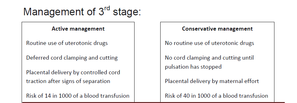 • IV syntocinon infusion should commence ( 40iu of syntocinon – 500ml of Compound sodium lactate over 4hours if active bleeding has occurred)