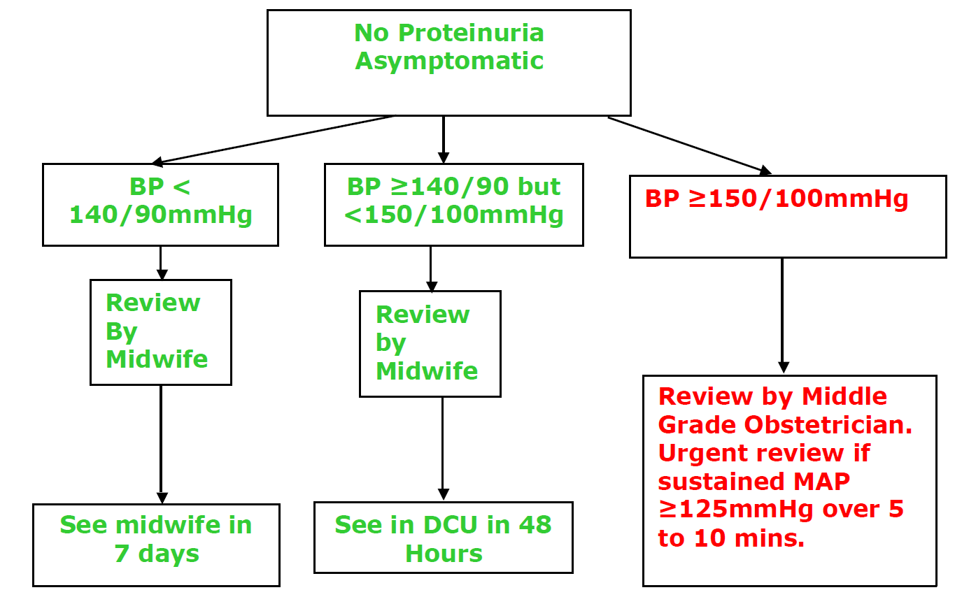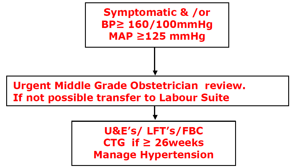 • BP > 160/100mmHg – Immediate Review By Middle Grade Obstetrician – If for some reason this is not possible, page Consultant Obstetrician on call (office hours) or transfer patient to Labour Suite.