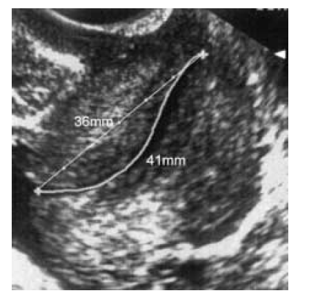 6. The sonolucent endocervical mucosa should be identified as a guide to the true position of the internal os. The callipers should be placed to measure the linear distance between the triangular area of echodensity at the external os and the V-shaped notch at the internal os.