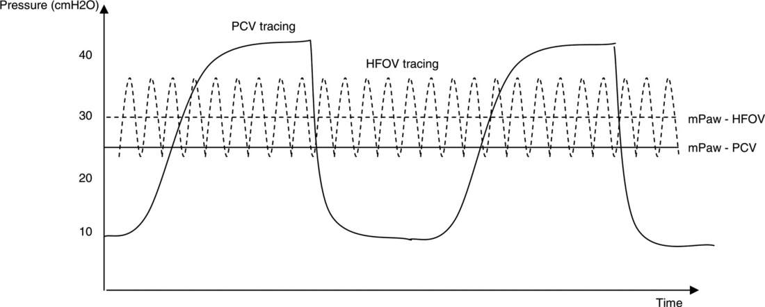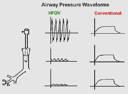 High frequency oscillatory ventilation (HFOV) utilises rapid ventilation rates with small tidal volumes (often less than anatomical dead space) and active inspiratory AND expiratory phases.  A constant distending airway pressure is applied to the alveoli which aims to maximise functional residual capacity and ventilation/perfusion matching, over which small tidal volumes are superimposed at a high rate.