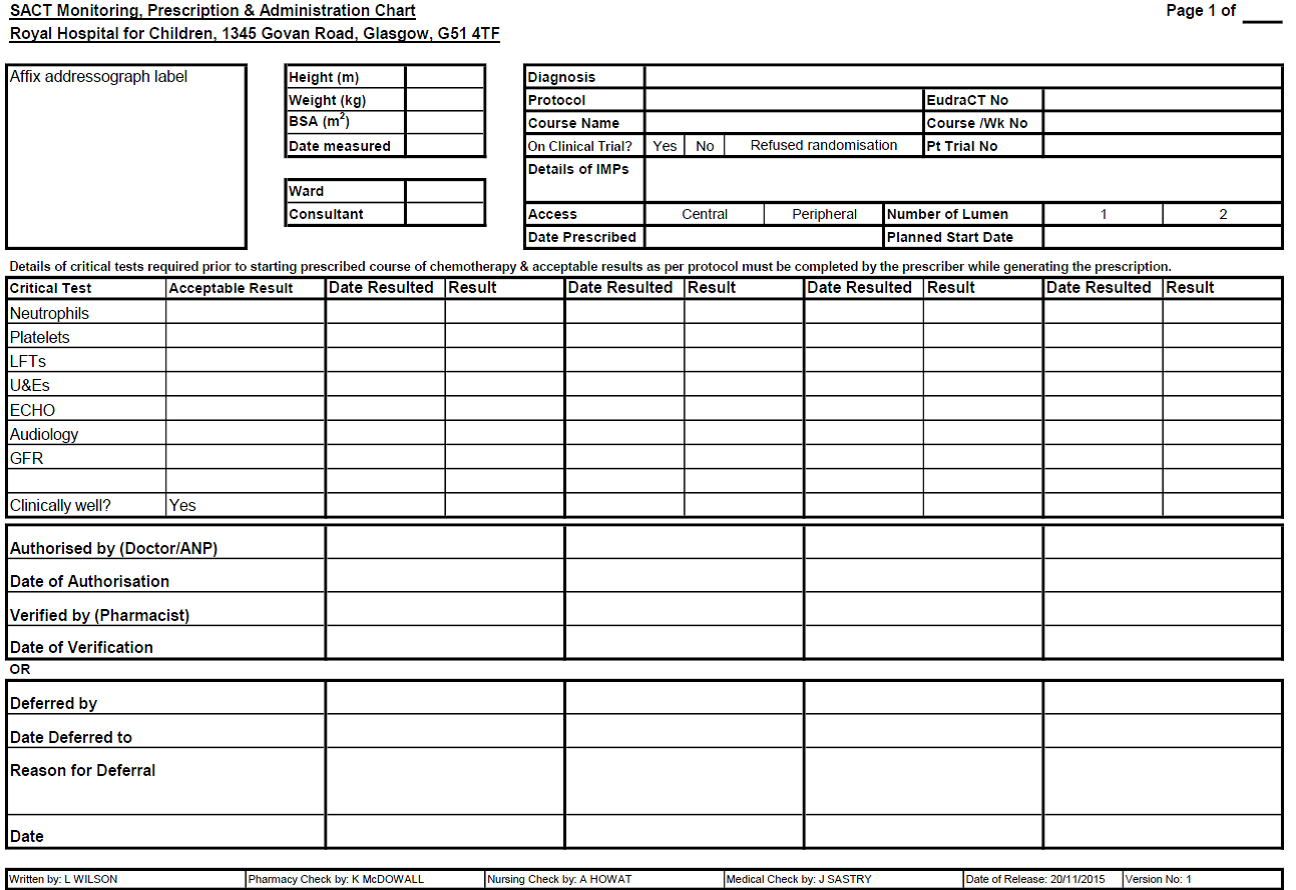 Appendix 3: SACT Monitoring, Prescription & Administration Chart (Critical Test Confirmation Sheets (Green Sheet) - RHC-HAEM-ONC-TEMP-005)