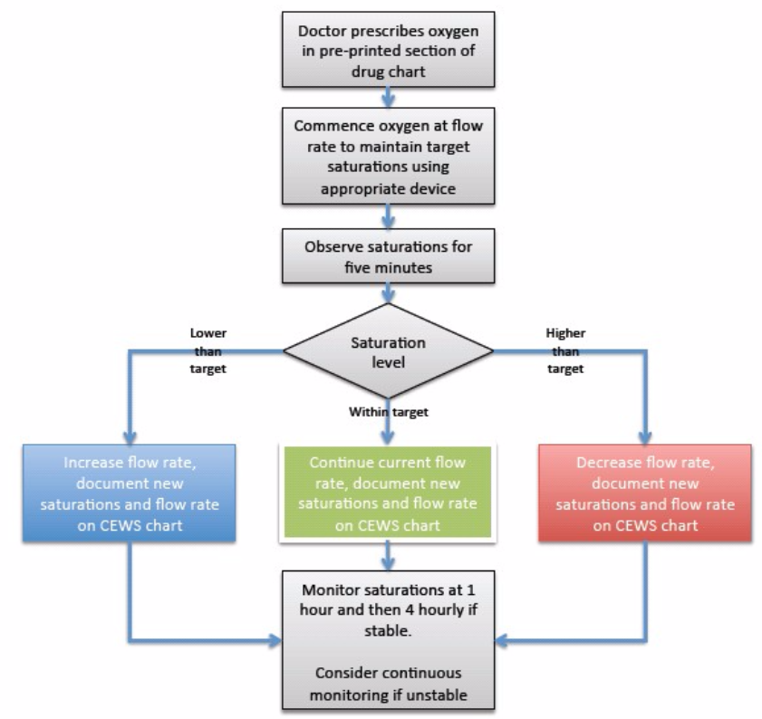 If the patient falls outside the target saturation range, the oxygen therapy will be adjusted accordingly.Saturations should then be monitored continuously for at least 5 minutes and recorded on the CEWS chart after any increase or decreasein oxygen dose to ensure that the patient acheives the desired saturation range.