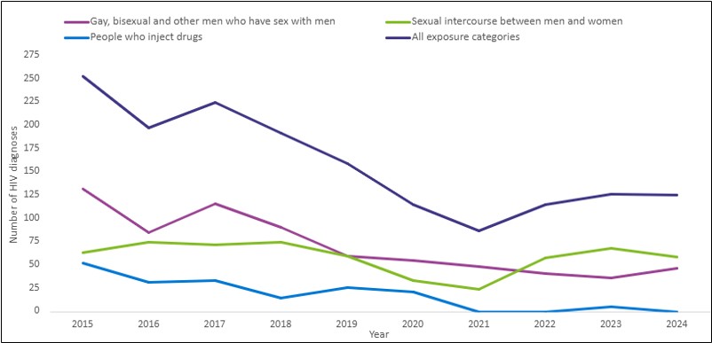 - Data for 2024 indicate a total of 375 newly reported diagnoses, the second highest number of reports of HIV in the last 10 years; 125 of these were first ever diagnoses2.