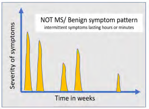 Clinical MS inflammation (relapse) typically presents with a specific focal symptom evolving over hours to days (rarely stroke–like), persisting for days to weeks, then gradually resolving, often completely. Relapses are not characterised by numerous, non-focal symptoms waxing and waning over long periods of time.