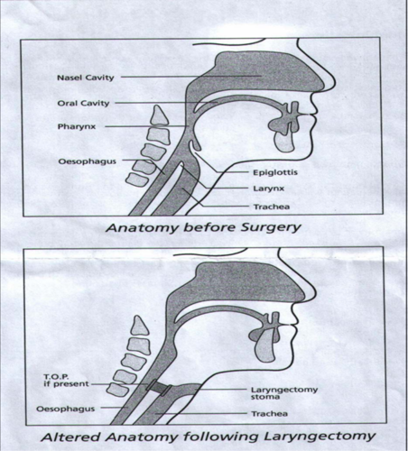 Laryngectomy results in loss of ‘normal’ voice and formation of a stoma. These changes mark the individual as different and some stigma may be attached to the changes causing negative reactions in others9. Perceived stigma can have a significant impact on work, recreation, financial situation, family relationships, social relationships, community involvement and self-expression and result in low mood and depression. Nurses can plan care strategies to minimise perceived and actual stigmatization and promote adjustment to the laryngectomy by the patient and their carers/family9.