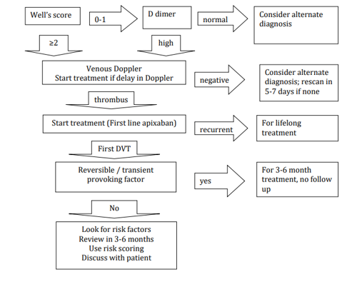 If D-Dimer positive without any other possible cause: Discharge home, and review in 1 week for possible repeat Doppler ultrasound. Decide on interim anticoagulation case by case. If D-Dimer result negative: DVT unlikely, consider alternative diagnosis and discharge. |