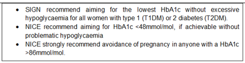 A target HbA1c of < 48 mmol/mol should be the aim, if achievable without problematic hypoglycaemia. It is, however, noted that this target may not be achievable and so failure to reach this target should not be a contraindication to pregnancy. Women should be counselled that the risks of adverse pregnancy outcomes are reduced with any reduction in HbA1c.