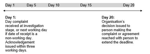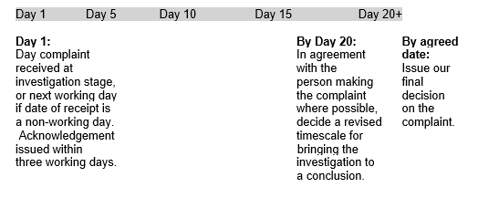 - a statement advising that, should it not be possible to send a report within 20 working days, the person making the complaint will be provided with an explanation as to why there is a delay and, where possible, provided with a revised timetable for the investigation.