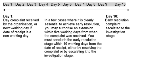 It is important that extensions to the timeline do not become the norm. Rather, the timeline at the early resolution stage should be extended only rarely. All attempts to resolve the complaint at this stage must take no longer than ten working days from the date you receive the complaint.