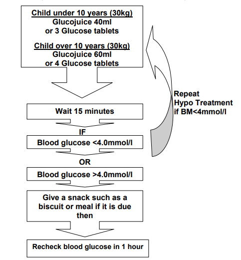 - Aim to maintain blood glucose between 7-13mmol/l but do not worry if blood glucose rises above 13mmol/l. Seek advice from Diabetes Team but DO NOT decrease rate of Dextrose infusion (if running) without discussion with Paediatric clinical team on call.