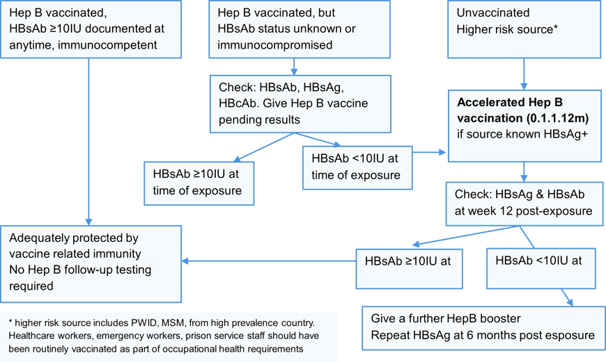 *High prevalence countries or risk-groups are those where there is a significant likelihood of the index case individual being HIV positive and not taking effective treatment (in most cases this equates to being undiagnosed). Within the UK at present, this is likely to be MSM (men who have sex with men), people who inject drugs from high-risk countries and individuals who have immigrated to the UK from areas of high HIV prevalence, particularly sub-Saharan Africa (high prevalence is >1%). HIV prevalence country specific HIV prevalence can be found at https://aidsinfo.unaids.org ** If patient HIV positive and undetectable the same evidence base for U=U does not exist for non-sexual exposures although it remains unlikely that PEP would be indicated. |