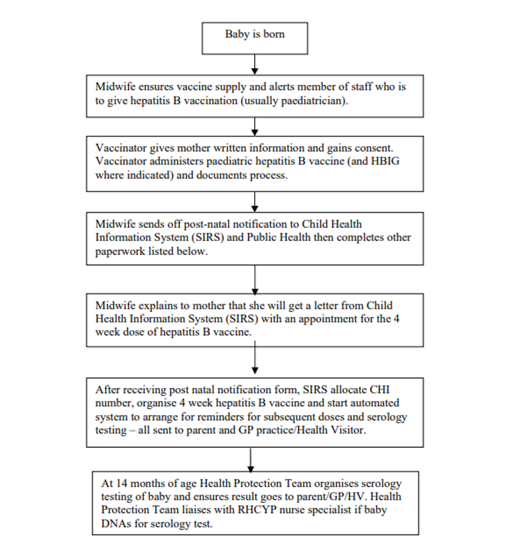 The purpose of this pack is to prevent perinatal transmission by ensuring that babies born to mothers with hepatitis B infection receive their first dose of hepatitis B vaccine within 24 hours (preferably at birth) and that systems are in place for subsequent doses and follow up. Hepatitis B infection/positive is defined as mothers who are Hepatitis B surface antigen positive (HBsAg) in pregnancy.