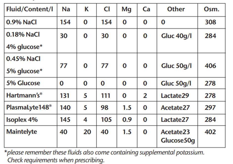 Preferred maintenance fluids: 0.18% Sodium Chloride 4% Glucose with or without added potassium 40mmol in a litre or Maintelyte. This fluid if given at the correct rate (Table 1) provides all water and Na+/K+ requirements until the patient can eat and drink or be fed. Excess volumes of this fluid (or any fluid) may cause hyponatraemia.