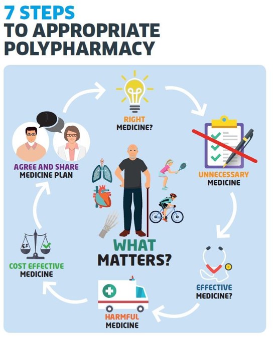 The 7-Steps to appropriate polypharmacy demonstrates that the patient review process is not in fact a linear one off event, but cyclical, requiring regular repeat and review. The circle is centred around what matters to the patient, as they play a vital part in making informed decisions about their medicines, as long as they provided with the right information, tools and resources.