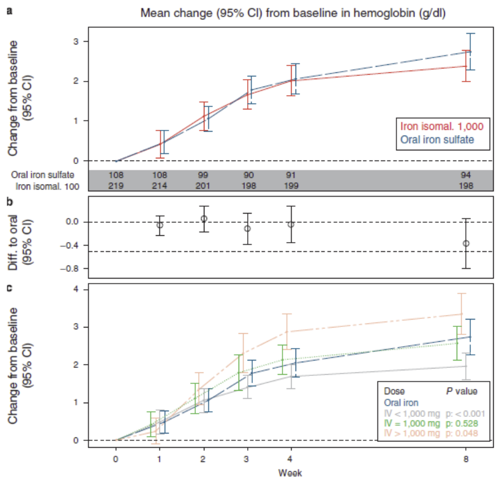 In medical patients with inflammatory bowel disease, both PO and IV Iron increased haemoglobin from baseline9: