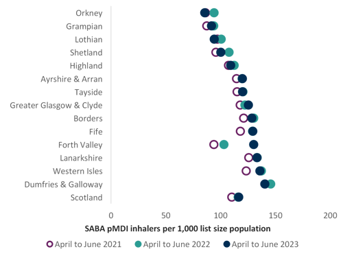 This guide includes an indicator chart of people prescribed three or more SABA inhalers as an aspirational level, as a person with well-controlled asthma would need no more than this (see Chart 2). This should be discussed at their annual routine review. This indicator is a guide and is unable to distinguish between people with asthma and COPD.