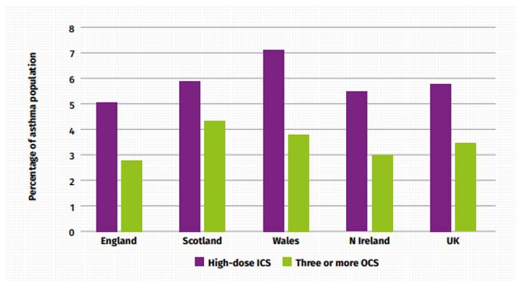 - The figure below outlines the differences in difficult or severe asthma prevalence, based on the indicators of high-dose ICS or those receiving three or more OCS courses across the nations in the UK in 2016.37