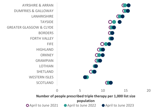 The chart below illustrates the use of triple therapy prescribing, as either separate inhalers or as a single triple inhaler, showing wide variation between NHS Boards, ranging from 15.63 in Ayrshire & Arran to 6.13 in the Western Isles. This may vary with prevalence of COPD within board regions.