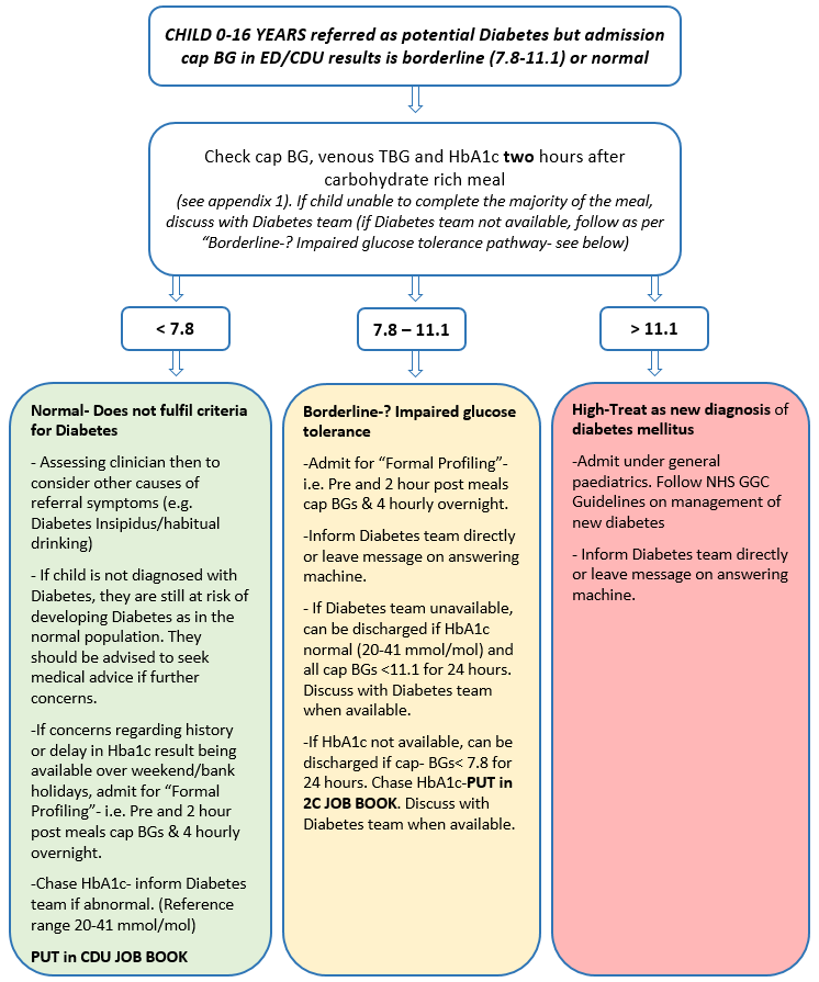To guide how to manage children who have been referred for possible Diabetes but a repeat random capillary blood glucose (cap BG) in ED/CDU is in the borderline or normal range