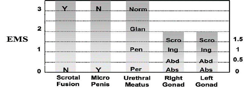 In the normal male child HCG increases testicular secretion of testosterone. This test examines the capacity of Leydig cells to respond to HCG and secrete testosterone. See figure 1 below to calculate an external masculinisation score. More detailed guidance on specific investigations required can be found on the Scottish Differences of Sex Development website.