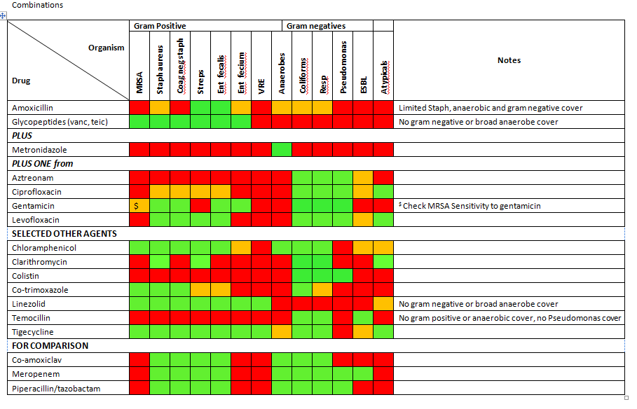 Sepsis of unknown focus Aztreonam 2 grams every 8 hours (as NHS Tayside), can increase to 6 hourly dosing if required PLUS metronidazole 500mg x 3 PLUS vancomycin (covers MRSA) If strong suspicion of group A Strep or Staph Toxic Shock Syndrome, discuss with microbiology and consider adding clindamycin and using immunoglobulin.