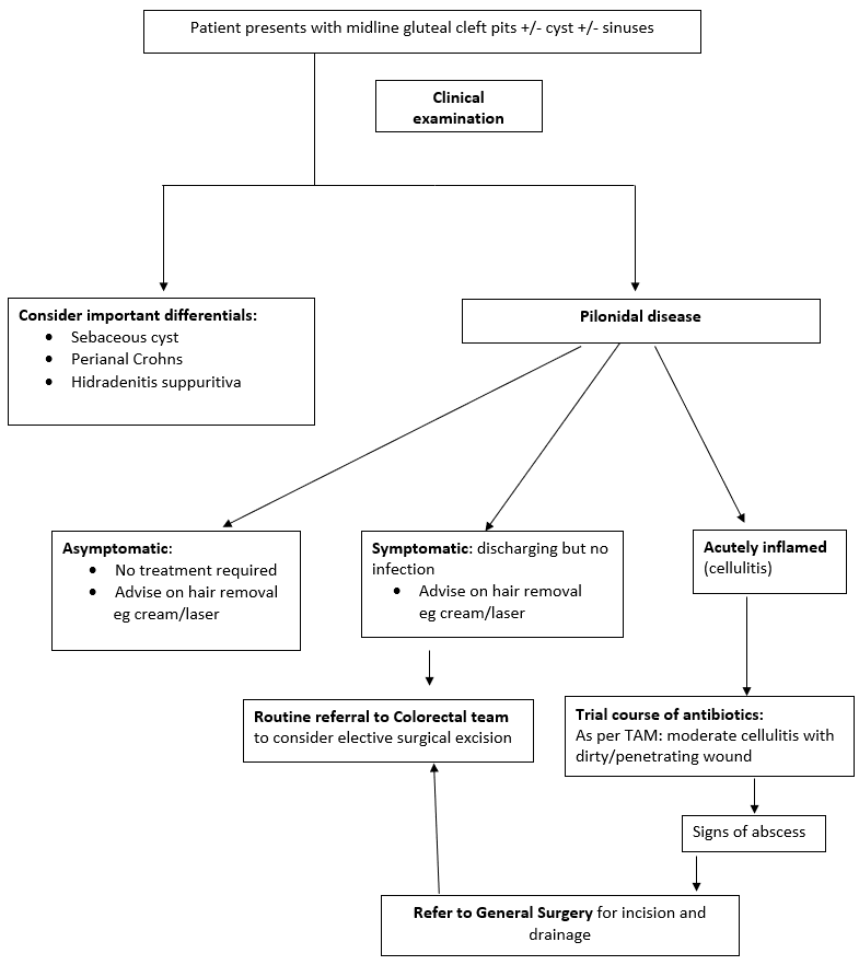 1. ASCRS- Johnson EK, Vogel JD, Cowan ML, Feingold DL, Steele SR; Clinical Practice Guidelines Committee of the American Society of Colon and Rectal Surgeons. The American Society of Colon and Rectal Surgeons' Clinical Practice Guidelines for the Management of Pilonidal Disease. Dis Colon Rectum. 2019 Feb;62(2):146-157. doi: 10.1097/DCR.0000000000001237. PMID: 30640830.