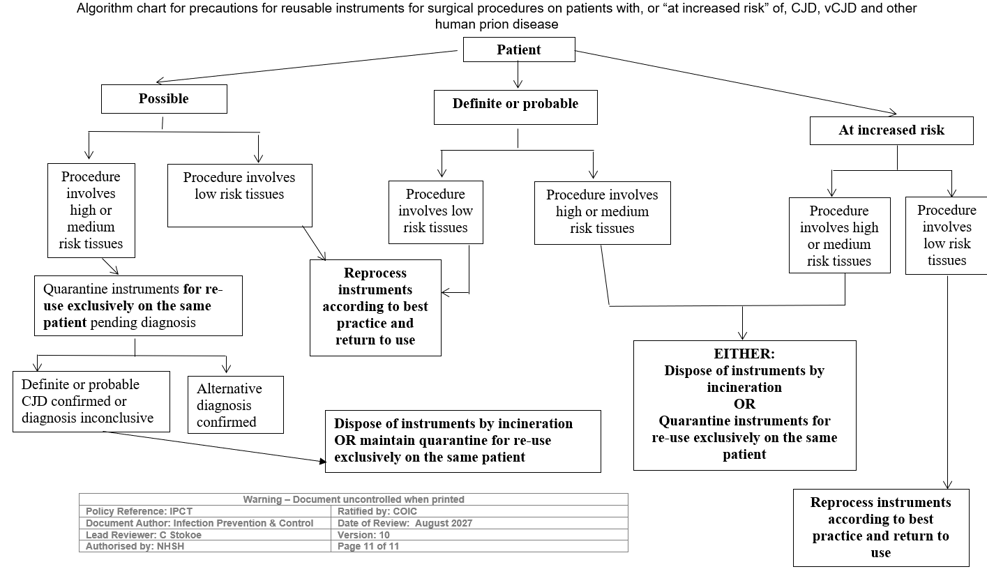 A variant form of CJD was identified in 1996, which was described as being identical to Bovine Spongiform Encephalopathy (BSE). It was thought to have been transmitted to humans by eating contaminated meat products. Other instances of transmission of CJD have been described via receiving blood products and occasionally through instruments contaminated with CJD. Unlike micro-organisms, prions are not destroyed by conventional methods of decontamination and sterilisation, therefore a risk assessment has to be undertaken before any clinical procedure where there is considered to be a risk of potential transmission.