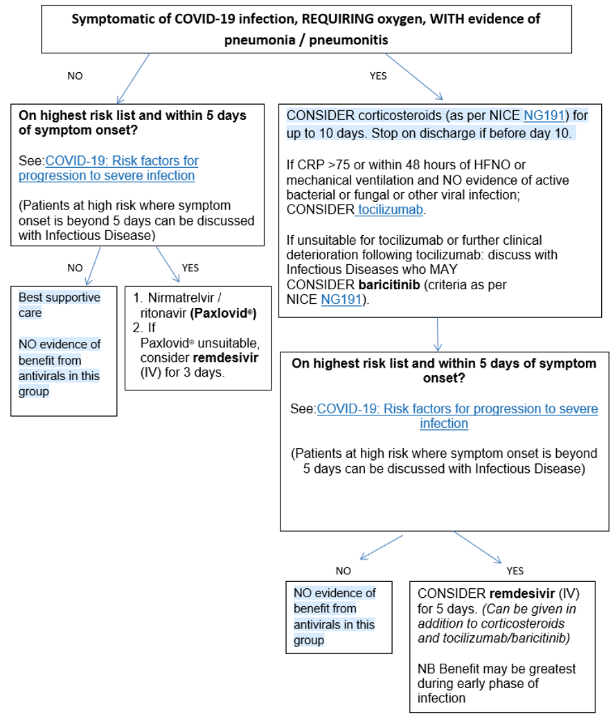 See manufacturer’s information (emc) before prescribing tocilizumab, remdesivir and nirmatrelvir / ritonavir as these are all licensed treatments for COVID-19 infection.