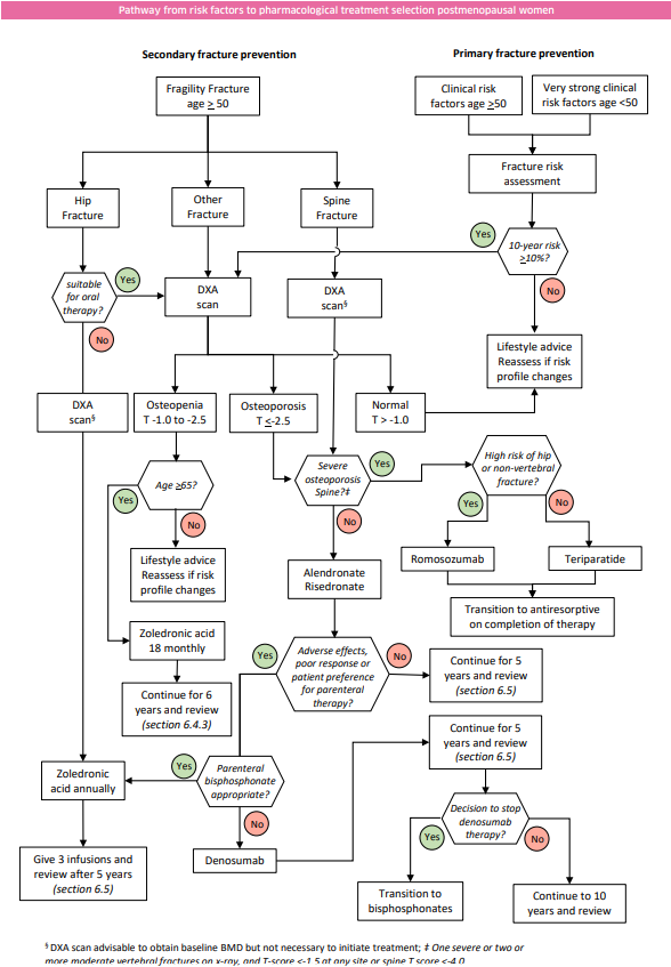 There are some situations where other therapies may be considered in a first line setting. Eg, teriparatide (includes parathyroid biosimilars) for severe spinal osteoporosis, romosozumab for severe osteoporosis of the spine and high non vertebral fracture risk and zoledronic acid following recent hip fracture (SIGN142 Osteoporosis QRG).