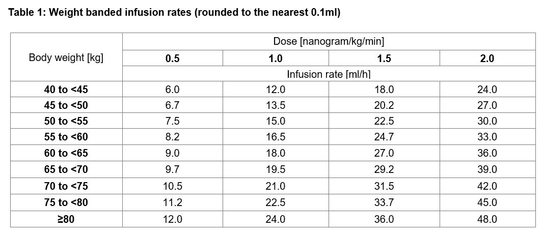 Alternatively, table 1 below details weight banded infusion rates based on patient's actual body weight.