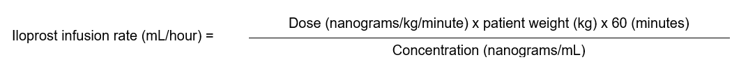 It is worth noting that unlike other medicines where the dose is fixed and given over a set period of time, the licensing for iloprost means that the duration of infusion is fixed, 6 hours, but the total dose will vary between patients depending on characteristics such as weight and tolerance. In some circumstances treatment may be extended beyond 6 hours in 24 hours at the discretion of the prescribing consultant. This is however on off label use and should be considered on a case by case basis.