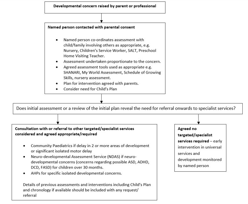 - Children with significant developmental delay, and suspected co-ordination problems, ADHD or autism spectrum disorders should be referred to Community Paediatrics.